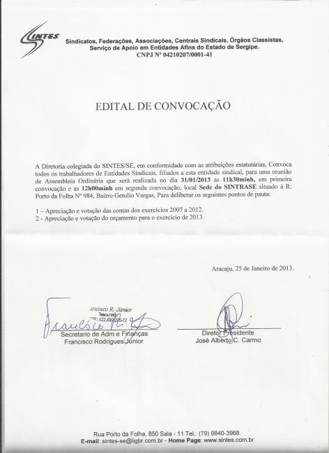 Edital de Convocação Assembleia Ordinária dia 31/01/2013